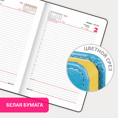 Внутренний блок включает 168 листов белой бумаги плотностью 70 г/м2. Каждая страничка имеет перфорированный угол. Благодаря стандартному формату А5 (138х213 мм) ежедневник удобно использовать как в офисе, так и на выездных деловых встречах.