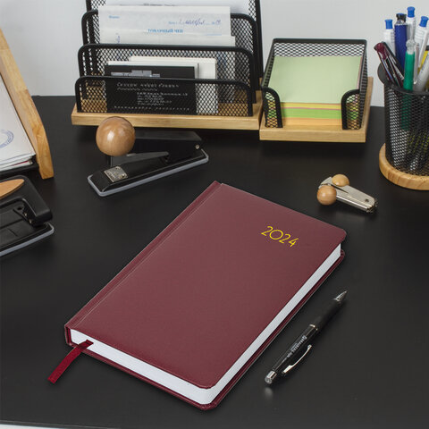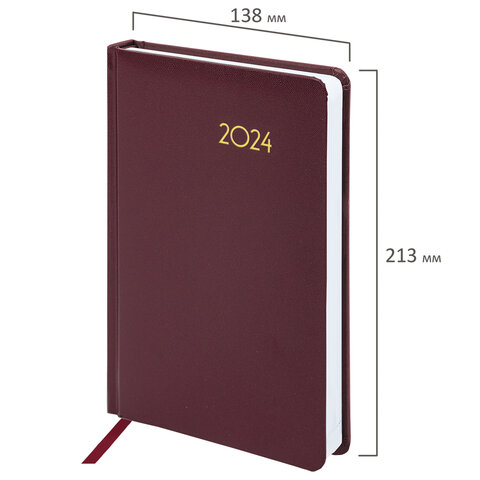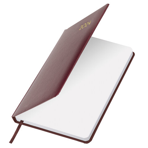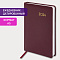 Внутренний блок включает 168 листов белой бумаги плотностью 70 г/м2. Каждая страничка имеет перфорированный угол. Благодаря стандартному формату А5 (138х213 мм) ежедневник удобно использовать как в офисе, так и на выездных деловых встречах. Жесткая книжная обложка, с легкой рельефной фактурой, напоминает натуральную кожу благородного бордового цвета. Материал обложки - балакрон, подходит для тиснения только фольгой. Дополнением является закладка-ляссе, с помощью которой при необходимости можно быстро открыть ежедневник на нужной странице. Помимо прочего, ежедневник снабжен обширным справочным материалом.