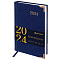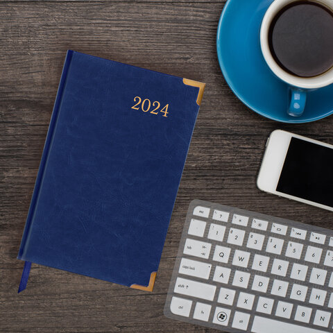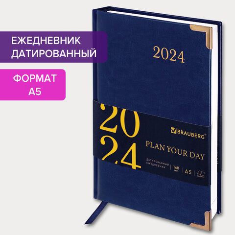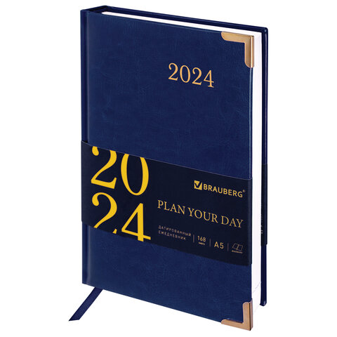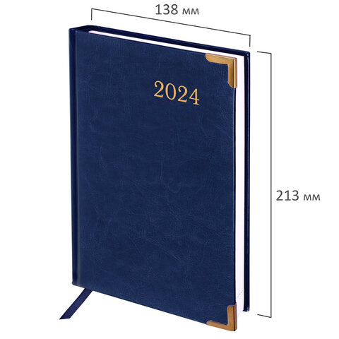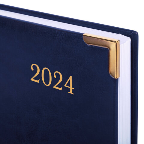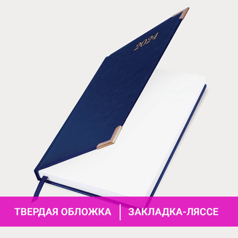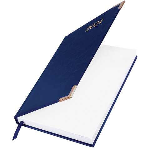 Внутренний блок включает 168 листов белой бумаги плотностью 70 г/м2. Каждая страничка имеет перфорированный угол. Благодаря стандартному формату А5 (138х213 мм) ежедневник удобно использовать как в офисе, так и на выездных деловых встречах. Твердая обложка стилизована под гладкую кожу благородного синего цвета. Подходит для горячего тиснения. Ежедневник имеет металлические уголки, что придает ему особый шарм. Дополнением является закладка-ляссе, с помощью которой при необходимости можно быстро открыть ежедневник на нужной странице. Помимо прочего, ежедневник снабжен обширным справочным материалом.
