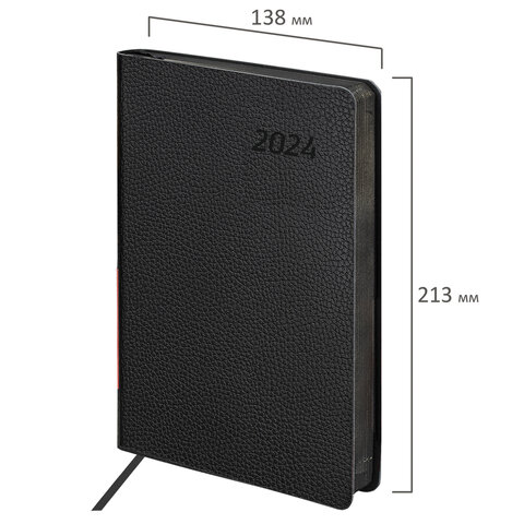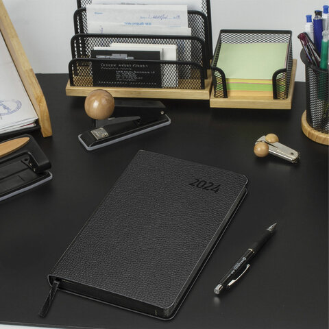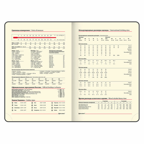 Внутренний блок включает 168 листов тонированной бумаги плотностью 70 г/м2. Каждая страничка имеет перфорированный угол. Благодаря стандартному формату А5 (138х213 мм) ежедневник удобно использовать как в офисе, так и на выездных деловых встречах. Мягкая (интегральная) обложка стилизована под фактурную кожу строгого черного цвета. Подходит для горячего тиснения. Дополнением является закладка-ляссе, с помощью которой при необходимости можно быстро открыть ежедневник на нужной странице. Помимо прочего, ежедневник снабжен справочным материалом.