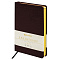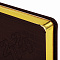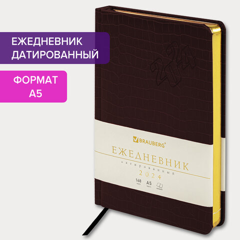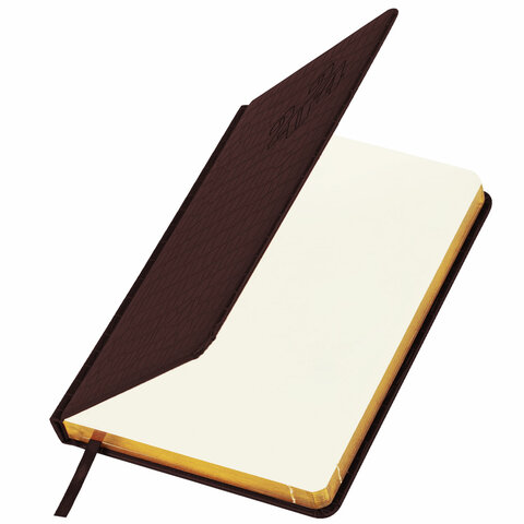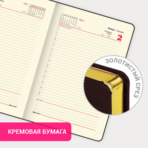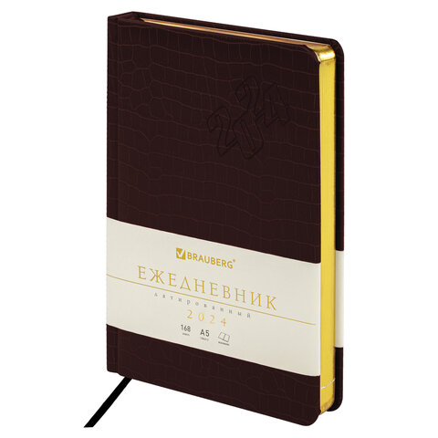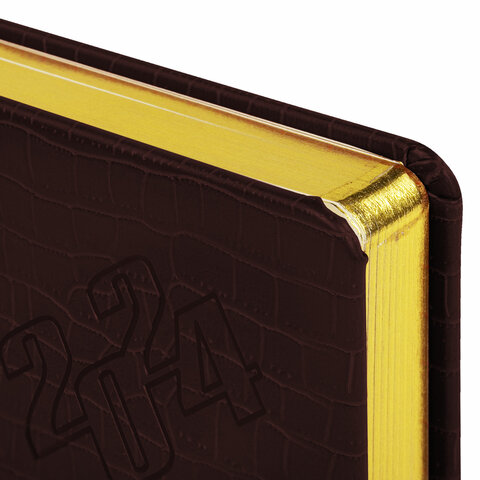 Внутренний блок включает 168 листов тонированной бумаги плотностью 70 г/м2. Каждая страничка имеет перфорированный угол. Благодаря стандартному формату А5 (138х213 мм) ежедневник удобно использовать как в офисе, так и на выездных деловых встречах. Твердая обложка стилизована под кожу крокодила. Материал обложки благородного коричневого цвета подходит для горячего тиснения. Срез ежедневника фольгирован золотой фольгой, что придает ему особый шарм. Дополнением является закладка-ляссе, с помощью которой при необходимости можно быстро открыть ежедневник на нужной странице. Помимо прочего, ежедневник снабжен обширным справочным материалом.