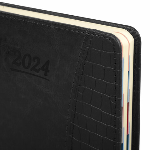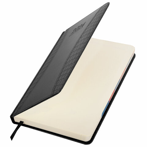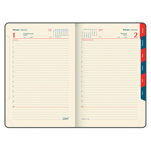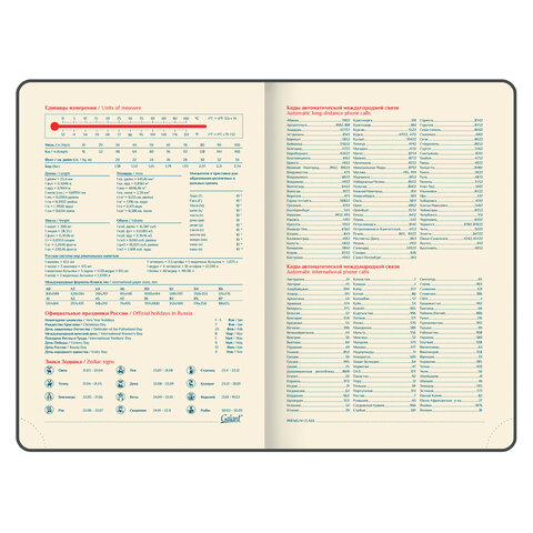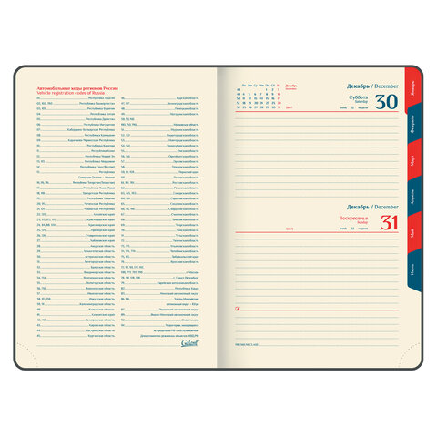 Дополнением является закладка-ляссе, с помощью которой при необходимости можно быстро открыть ежедневник на нужной странице, а также вырубка по месяцам. Помимо прочего, ежедневник снабжен обширным справочным материалом. Выполнен в благородном черном цвете.