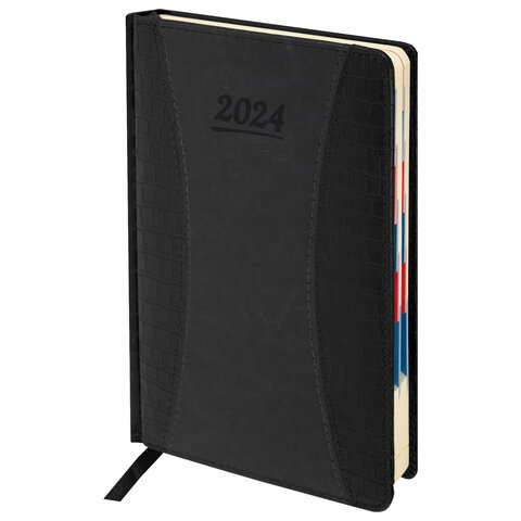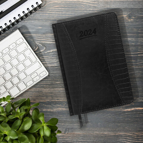 Внутренний блок включает 168 листов тонированной бумаги плотностью 70 г/м2. Каждая страничка имеет перфорированный угол. Благодаря стандартному формату А5 (148х218 мм) ежедневник удобно использовать как в офисе, так и на выездных деловых встречах. Твердая обложка состоит из двух материалов и стилизована под кожу крокодила с вставкой из материала под гладкую кожу. Материал обложки подходит для горячего тиснения.