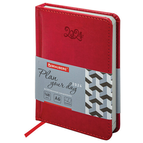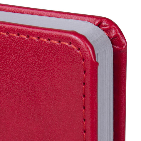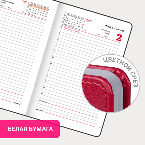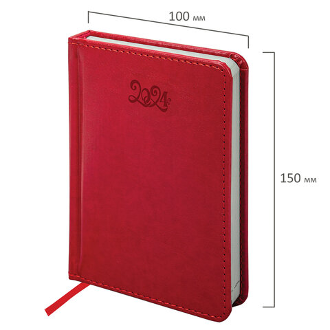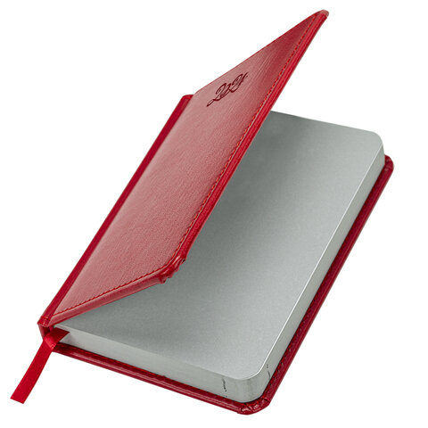 Внутренний блок включает 168 листов белой бумаги плотностью 70 г/м2. Каждая страничка имеет перфорированный угол. Благодаря малому формату А6 (100х150 мм) ежедневник удобно использовать как в офисе, так и на выездных деловых встречах. Твердая обложка яркого красного цвета стилизована под гладкую кожу. Подходит для горячего тиснения. Срез и форзац ежедневника окрашены на контрасте с цветом обложки, что придает ему особый шарм. Дополнением является закладка-ляссе, с помощью которой при необходимости можно быстро открыть ежедневник на нужной странице. Помимо прочего, ежедневник снабжен обширным справочным материалом.