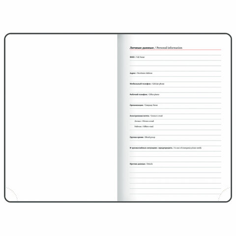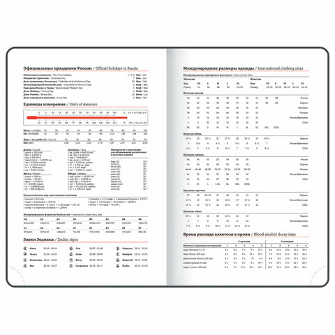 Внутренний блок включает 168 листов белой бумаги плотностью 70 г/м2. Каждая страничка имеет перфорированный угол. Благодаря стандартному формату А5 (138x213 мм) ежедневник удобно использовать как в офисе, так и на выездных деловых встречах. Твердая обложка стилизована под текстурную кожу. Материал обложки подходит для горячего тиснения. Дополнением является закладка-ляссе, с помощью которой при необходимости можно быстро открыть ежедневник на нужной странице. Ежедневник фиксируется стильной металлической застежкой, поэтому он не откроется в сумке или портфеле и страницы не помнутся. Ежедневник снабжен обширным справочным материалом.