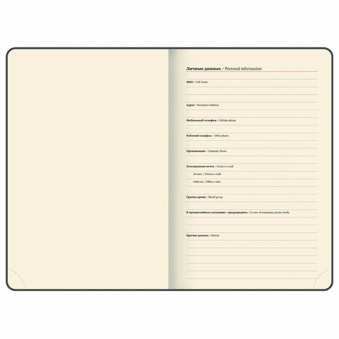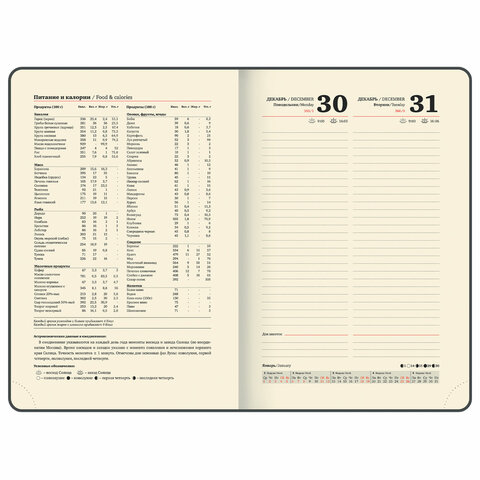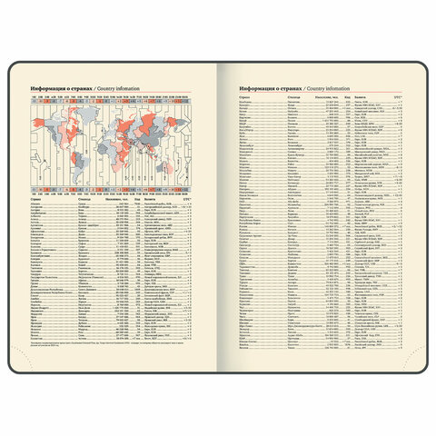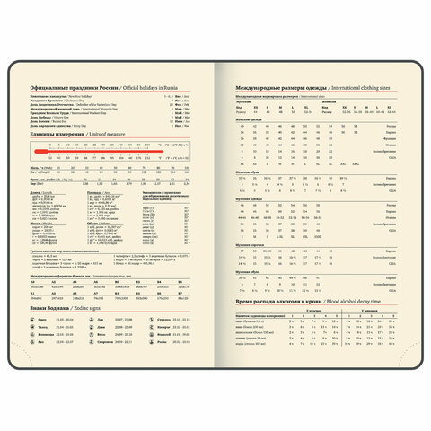 Внутренний блок включает 168 листов кремовой бумаги плотностью 70 г/м2. Каждая страничка имеет перфорированный угол. Благодаря классическому формату А5 (151х213 мм) ежедневник удобно использовать как в офисе, так и на выездных деловых встречах. Твердая обложка стилизована под кожу с легкой текстурной поверхностью, приятной на ощупь. Материал обложки подходит для горячего тиснения. Дополнениями являются две закладки-ляссе, с помощью которой при необходимости можно быстро открыть или зафиксировать нужную страницу, и держатель для ручки. Резинка-фиксатор не позволит ежедневнику открыться в сумке или портфеле, поэтому страницы не помнутся. Ежедневник снабжен обширным справочным материалом.
