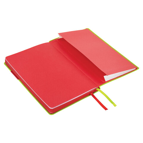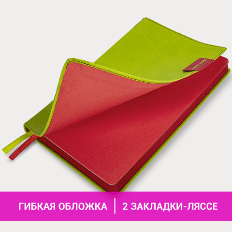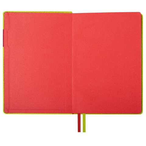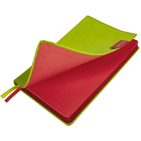 Внутренний блок включает 136 листов белой бумаги плотностью 70 г/м2. Благодаря стандартному формату А5 ежедневник удобно использовать как в офисе, так и на выездных деловых встречах. Интегральная обложка стилизована под гладкую кожу и прошита по периметру. Подходит для горячего тиснения. На внутренней стороне задней обложки есть декоративный конверт для разных мелочей в виде визиток, напоминалок или других милых и полезных мелочей. Срез и форзац ежедневника окрашены в контрастный цвет с обложкой, что придает ему особый шарм. Дополнением являются две закладки-ляссе, с помощью которых можно быстро открыть или зафиксировать ежедневник на нужной странице, а также держатель для ручки на контрасте с обложкой.