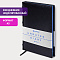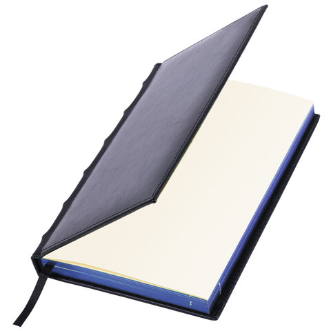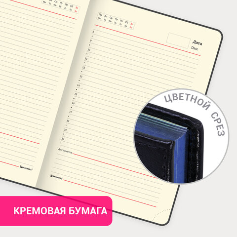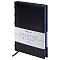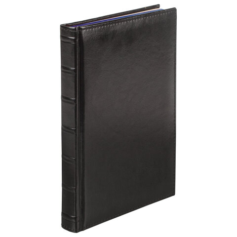 Внутренний блок включает 160 листов тонированной бумаги плотностью 70 г/м2. Каждая страничка имеет перфорированный угол. Благодаря стандартному формату А5 ежедневник удобно использовать как в офисе, так и на выездных деловых встречах. Твердая обложка стилизована под старинную кожу, подходит для горячего тиснения. Срез ежедневника фольгинирован синей фольгой, что придает ему особый шарм. Дополнением является закладка-ляссе, с помощью которой при необходимости можно быстро открыть ежедневник на нужной странице. Помимо прочего ежедневник снабжен обширным справочным материалом.