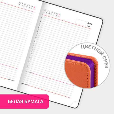 Внутренний блок включает 136 листов белой бумаги плотностью 70 г/м2. Каждая страничка имеет перфорированный угол. Благодаря стандартному формату А5 (138х213 мм) ежедневник удобно использовать как в офисе, так и на выездных деловых встречах. Твердая обложка стилизована под гладкую кожу. Подходит для горячего тиснения. Срез и форзац ежедневника окрашены на контрасте с цветом обложки, что придает ему особый шарм. Дополнением является закладка-ляссе, с помощью которой при необходимости можно быстро открыть ежедневник на нужной странице. Помимо прочего ежедневник снабжен обширным справочным материалом.