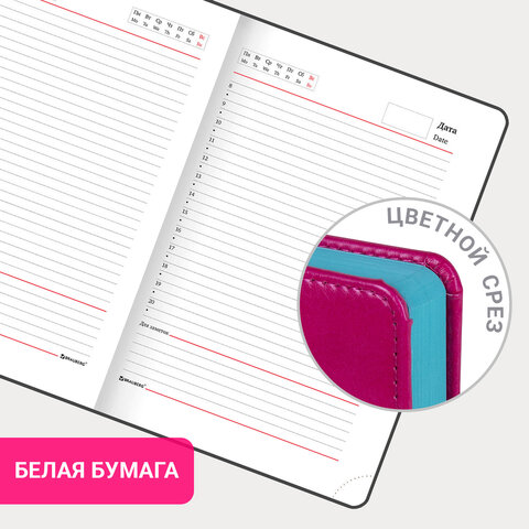 Внутренний блок включает 136 листов белой бумаги плотностью 70 г/м2. Каждая страничка имеет перфорированный угол. Благодаря стандартному формату А5 (138х213 мм) ежедневник удобно использовать как в офисе, так и на выездных деловых встречах. Твердая обложка стилизована под гладкую кожу. Подходит для горячего тиснения. Срез и форзац ежедневника окрашены на контрасте с цветом обложки, что придает ему особый шарм. Дополнением является закладка-ляссе, с помощью которой при необходимости можно быстро открыть ежедневник на нужной странице. Помимо прочего ежедневник снабжен обширным справочным материалом.