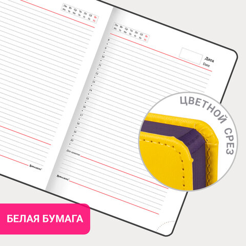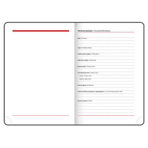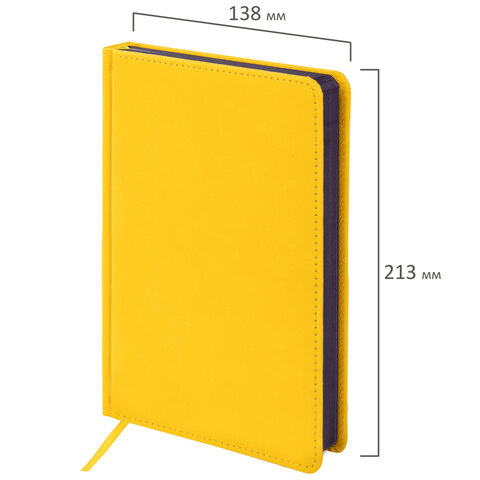 Внутренний блок включает 136 листов белой бумаги плотностью 70 г/м2. Каждая страничка имеет перфорированный угол. Благодаря стандартному формату А5 (138х213 мм) ежедневник удобно использовать как в офисе, так и на выездных деловых встречах. Твердая обложка стилизована под гладкую кожу. Подходит для горячего тиснения. Срез и форзац ежедневника окрашены на контрасте с цветом обложки, что придает ему особый шарм. Дополнением является закладка-ляссе, с помощью которой при необходимости можно быстро открыть ежедневник на нужной странице. Помимо прочего ежедневник снабжен обширным справочным материалом.