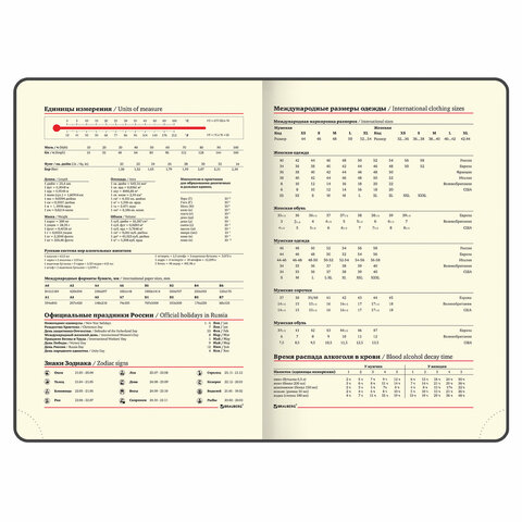 Внутренний блок включает 136 листов тонированной бумаги цвета "слоновая кость" плотностью 70 г/м2. Благодаря стандартному формату А5 ежедневник удобно использовать как в офисе, так и на выездных деловых встречах. Интегральная (мягкая) обложка с полноцветной печатью делает ежедневник неповторимым и запоминающимся. Срез ежедневника прокрашен, что придает ему особый шарм. Дополнением является закладка-ляссе, с помощью которой можно быстро открыть ежедневник на нужной странице.