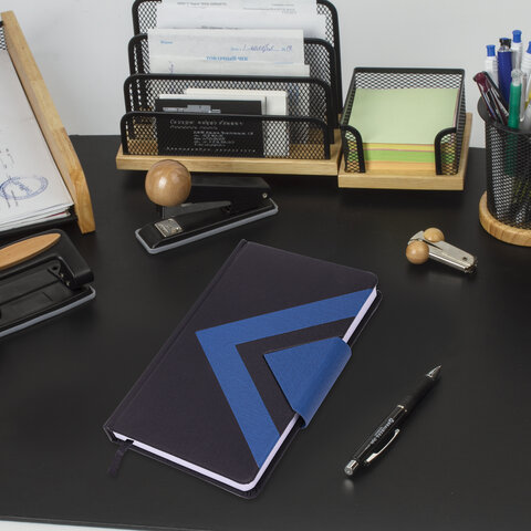 Внутренний блок включает 160 листов белой бумаги плотностью 70 г/м2. Каждая страничка имеет перфорированный угол. Благодаря стандартному формату А5 (138x213 мм) ежедневник удобно использовать как в офисе, так и на выездных деловых встречах. Твердая обложка, стилизованная под гладкую кожу, подходит для горячего тиснения. Снабжен магнитной застежкой, благодаря чему ежедневник не откроется в сумке или портфеле. Форзац ежедневника представлен картами мира и России. Дополнением является закладка-ляссе, с помощью которой при необходимости можно быстро открыть ежедневник на нужной странице. Помимо прочего ежедневник снабжен справочным материалом. Выполнен в комбинации из двух цветов - синий и черный.