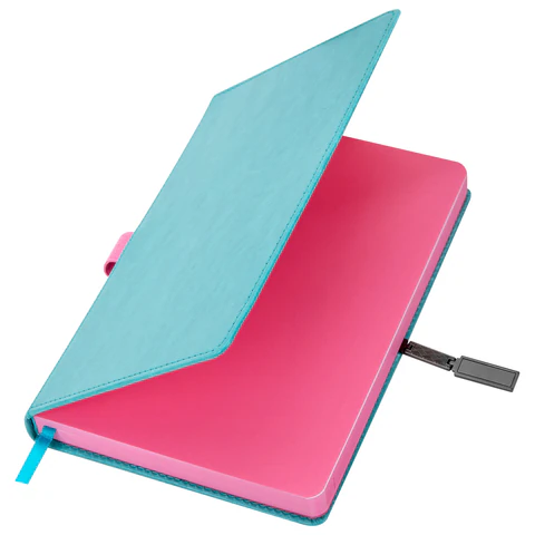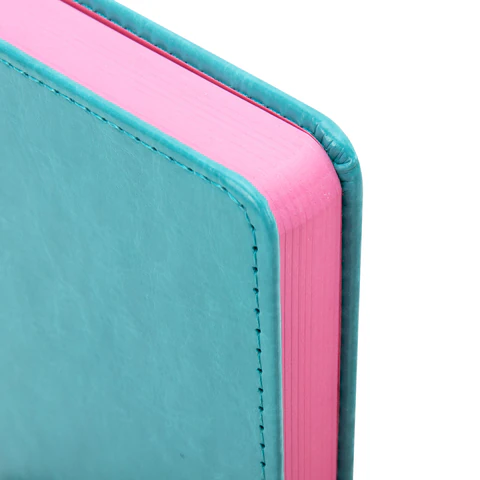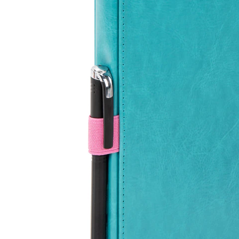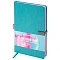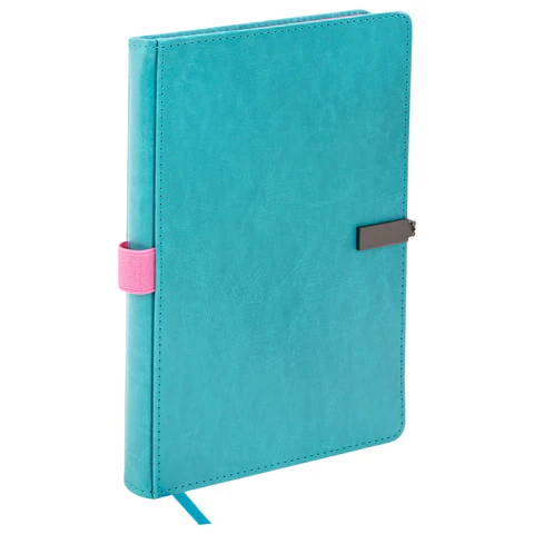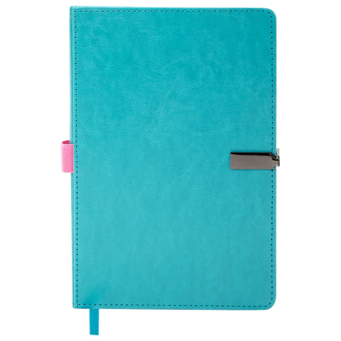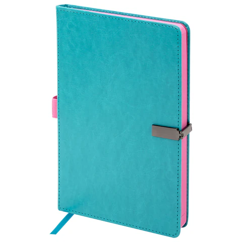 Твердая обложка стилизована под гладкую кожу бирюзового цвета. Материал обложки подходит для горячего тиснения. Для удобства пользования ежедневник снабжен держателем для ручки, а также стильной магнитной застёжкой. Цветной срез в контраст обложки придает ежедневнику особый шарм. Дополнением является закладка-ляссе, с помощью которой при необходимости можно быстро открыть ежедневник на нужной странице. Ежедневник снабжен обширным справочным материалом. В конце есть 4 страницы для записей и заметок.