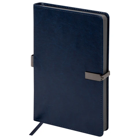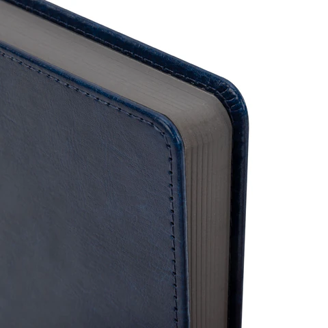 Твердая обложка стилизована под гладкую кожу синего цвета. Материал обложки подходит для горячего тиснения. Для удобства пользования ежедневник снабжен держателем для ручки, а также стильной магнитной застёжкой. Цветной срез в контраст обложки придает ежедневнику особый шарм. Дополнением является закладка-ляссе, с помощью которой при необходимости можно быстро открыть ежедневник на нужной странице. Ежедневник снабжен обширным справочным материалом. В конце есть 4 страницы для записей и заметок.