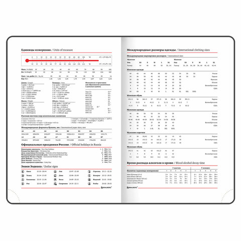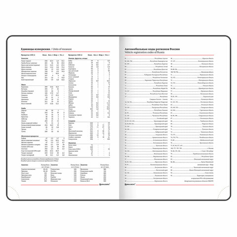 Внутренний блок включает 136 листов белой бумаги плотностью 70 г/м2. Благодаря стандартному формату А5 ежедневник удобно использовать как в офисе, так и на выездных деловых встречах. Твердая (книжная) обложка с полноцветной печатью и тиснением золотой фольгой делает ежедневник неповторимым и запоминающимся. Срез ежедневника фольгирован золотой фольгой, что придает ему особый шарм. Дополнением является закладка-ляссе, с помощью которой можно быстро открыть ежедневник на нужной странице.