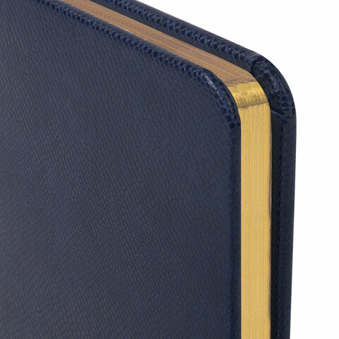 Твердая обложка стилизована под кожу рептилии благородного синего цвета. Подходит для горячего тиснения. Срез ежедневника фольгирован золотой фольгой, что придает ему особый шарм. На форзаце располагаются карты России и мира. Дополнением является закладка-ляссе, с помощью которой при необходимости можно быстро открыть ежедневник на нужной странице. Помимо прочего, ежедневник снабжен обширным справочным материалом.