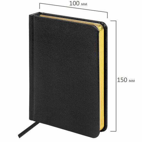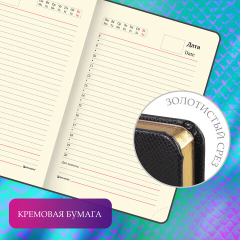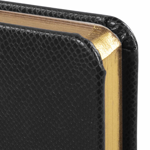 Внутренний блок включает 160 листов тонированной бумаги плотностью 70 г/м2. Каждая страничка имеет перфорированный угол. Благодаря формату А6 ежедневник удобно использовать как в офисе, так и на выездных деловых встречах. Твердая обложка, стилизованная под кожу рептилии, подходит для горячего тиснения. Срез ежедневника фольгирован под "золото", что придает ему особый шарм. Дополнением является закладка-ляссе, с помощью которой при необходимости можно быстро открыть ежедневник на нужной странице. Помимо прочего ежедневник снабжен обширным справочным материалом.