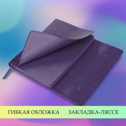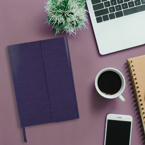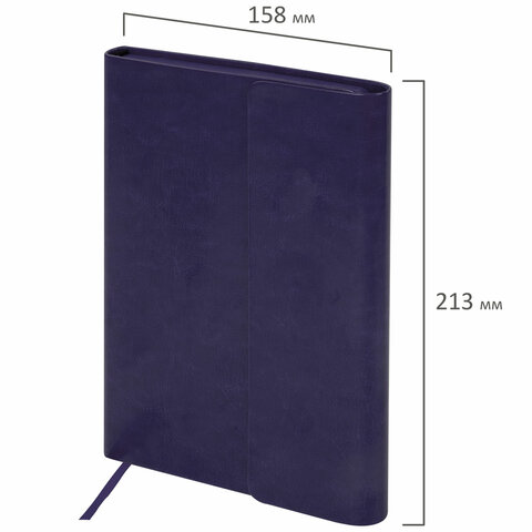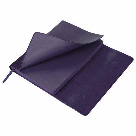 Внутренний блок включает 160 листов белой бумаги плотностью 70 г/м2. Каждая страничка имеет перфорированный угол. Благодаря стандартному формату А5 ежедневник удобно использовать как в офисе, так и на выездных деловых встречах. Интегральная (мягкая) обложка, выполненная в фиолетовом цвете и стилизованная под гладкую кожу, фиксируется магнитным клапаном, поэтому ежедневник не откроется в сумке или портфеле и страницы не помнутся. Подходит для горячего тиснения. Дополнением является закладка-ляссе, с помощью которой при необходимости можно быстро открыть ежедневник на нужной странице. Помимо прочего ежедневник снабжен обширным справочным материалом.
