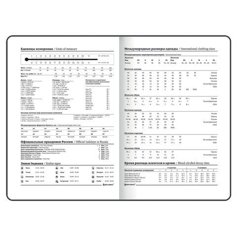 Внутренний блок содержит 128 листов офсетной бумаги плотностью 65 г/м2. Обложка 7БЦ (твердый переплет с матовой пленкой и тиснением фольгой) обеспечивает долгий срок службы. Снабжен резинкой-фиксатором, благодаря чему ежедневник не откроется в сумке или портфеле. Отличительная особенность - это поля, где можно проставить даты. Они не пропечатаны, поэтому владелец может отводить на каждый день сколько угодно листов и записывать все важные сведения.