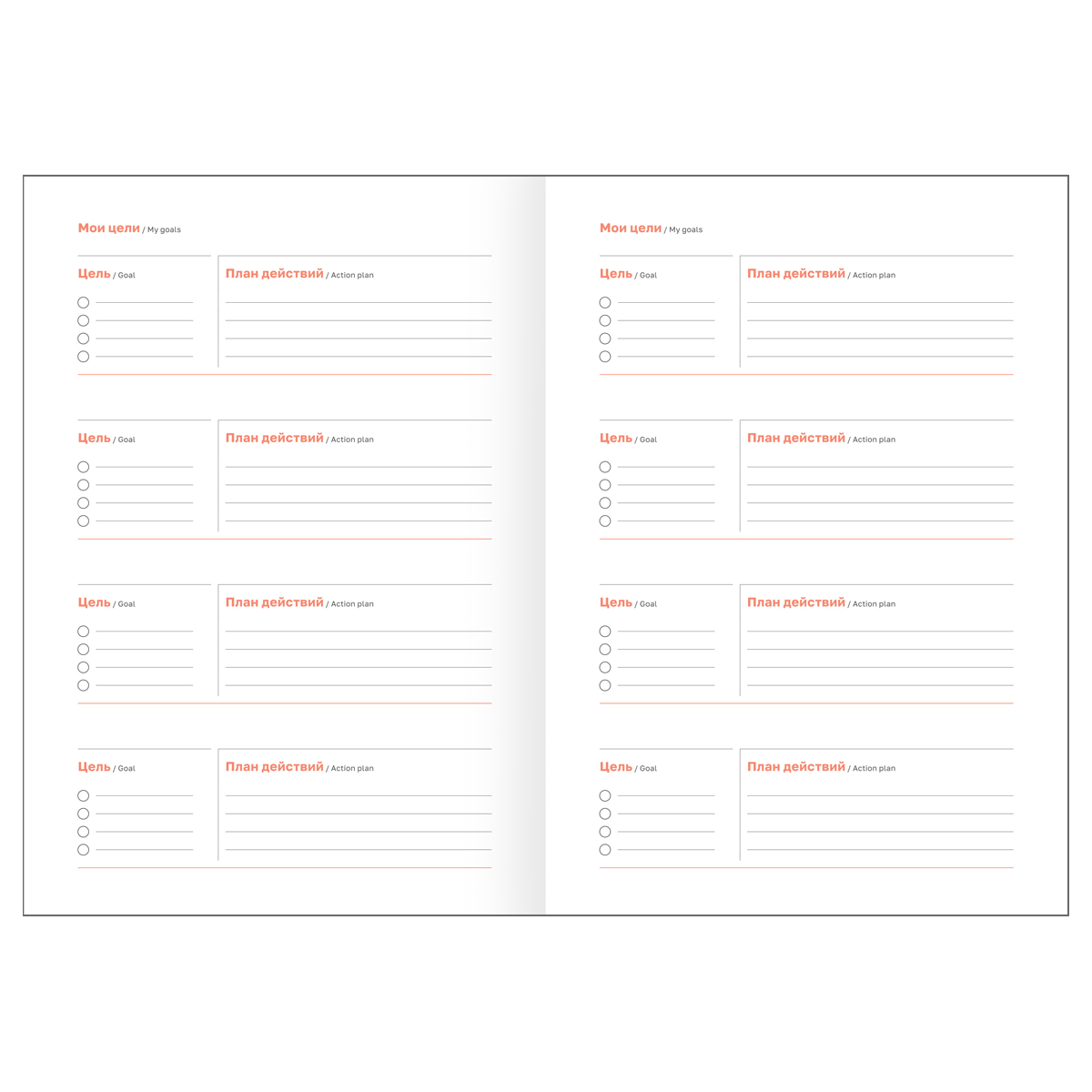 Внутренний блок состоит из 80 листов белой бумаги плотностью 70 г/м2 с печатью в 2 краски. Изделие представлено в формате А5.