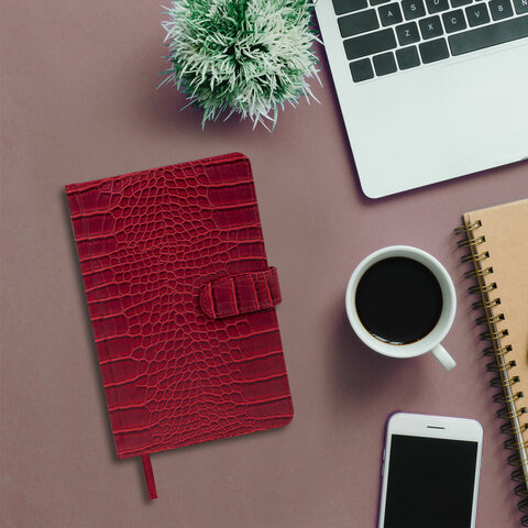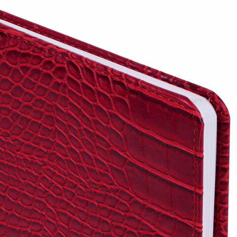 Внутренний блок включает 64 листа тонированной бумаги плотностью 70 г/м2. Благодаря стандартному формату А5 еженедельник удобно использовать как в офисе, так и на выездных деловых встречах. Твердая обложка, стилизованная под кожу крокодила, фиксируется магнитной застежкой, поэтому еженедельник не откроется в сумке или портфеле и страницы не помнутся. Подходит для горячего тиснения. Дополнением является закладка-ляссе, с помощью которой при необходимости можно быстро открыть еженедельник на нужной странице. Помимо прочего, еженедельник снабжен обширным справочным материалом. Выполнен в красном цвете.