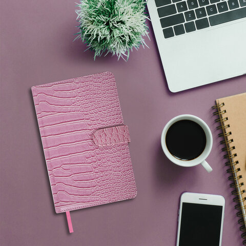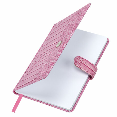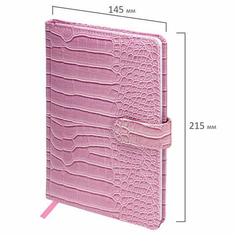 Внутренний блок включает 64 листа тонированной бумаги плотностью 70 г/м2. Благодаря стандартному формату А5 еженедельник удобно использовать как в офисе, так и на выездных деловых встречах. Твердая обложка, стилизованная под кожу крокодила, фиксируется магнитной застежкой, поэтому еженедельник не откроется в сумке или портфеле и страницы не помнутся. Подходит для горячего тиснения. Дополнением является закладка-ляссе, с помощью которой при необходимости можно быстро открыть еженедельник на нужной странице. Помимо прочего, еженедельник снабжен обширным справочным материалом. Выполнен в ярком розовом цвете.