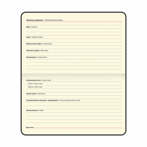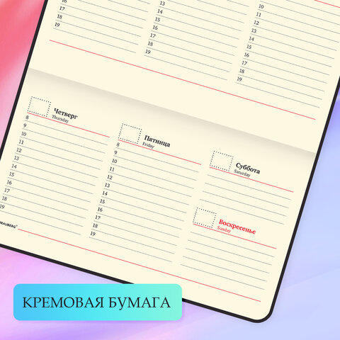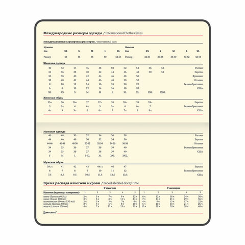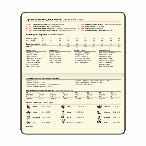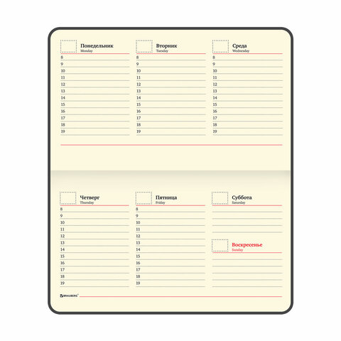 Внутренний блок содержит 64 листа офсетной бумаги кремового цвета плотностью 70 г/м2. Мягкая обложка с фактурой под гладкую кожу прошита по периметру. Подходит для горячего тиснения. Дополнением является закладка-ляссе, с помощью которой при необходимости можно быстро открыть еженедельник на нужной странице. Имеет обширный справочный материал.