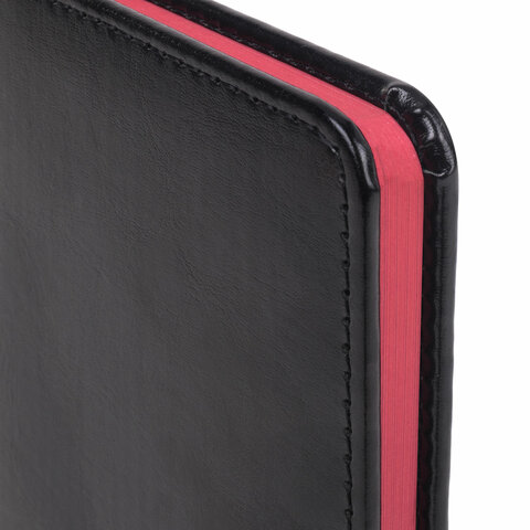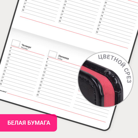 Твердая обложка, стилизованная под гладкую кожу, подходит для горячего тиснения. Срез и форзац еженедельника окрашены на контрасте с цветом обложки, что придает ему особый шарм. Дополнением является закладка-ляссе, с помощью которой при необходимости можно быстро открыть еженедельник на нужной странице. Помимо прочего, еженедельник снабжен обширным справочным материалом. Выполнен в классическом черном цвете.
