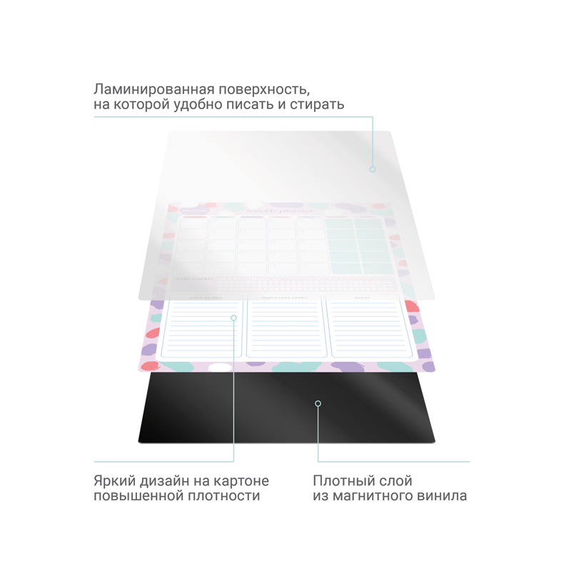 Магнитный планер на месяц MESHU Bright color – отличный помощник в планировании времени. Планер формата А3 выполнен из картона плотностью 200 г/м2, покрытого магнитным винилом. Ламинация позволяет многократно писать и стирать надписи. Размер магнитного расписания – 297*420 мм. В комплекте прилагается маркер на магните со стирателем, которым очень удобно корректировать записи и крепить его к любой металлической поверхности (например, к холодильнику). Внимание! Используйте только маркер на водной основе. Для очистки поверхности используйте влажную салфетку. Планер выполнен в универсальном оригинальном дизайне. Он поможет запомнить задачи, спланировать расписание и встречи с коллегами, друзьями или семьёй. Трекер привычек позволит вам добиться успехов в любых начинаниях: бегать по утрам, раньше вставать или ложиться спать и правильно питаться. <br/>Комплект упакован в индивидуальный пакет. <br/>• Формат: А3;<br/>• Размер: 297*420 мм;<br/>• Материал: картон, магнитный винил;<br/>• Плотность картона: 200 г/кв. м;<br/>• Пол: универсальный.