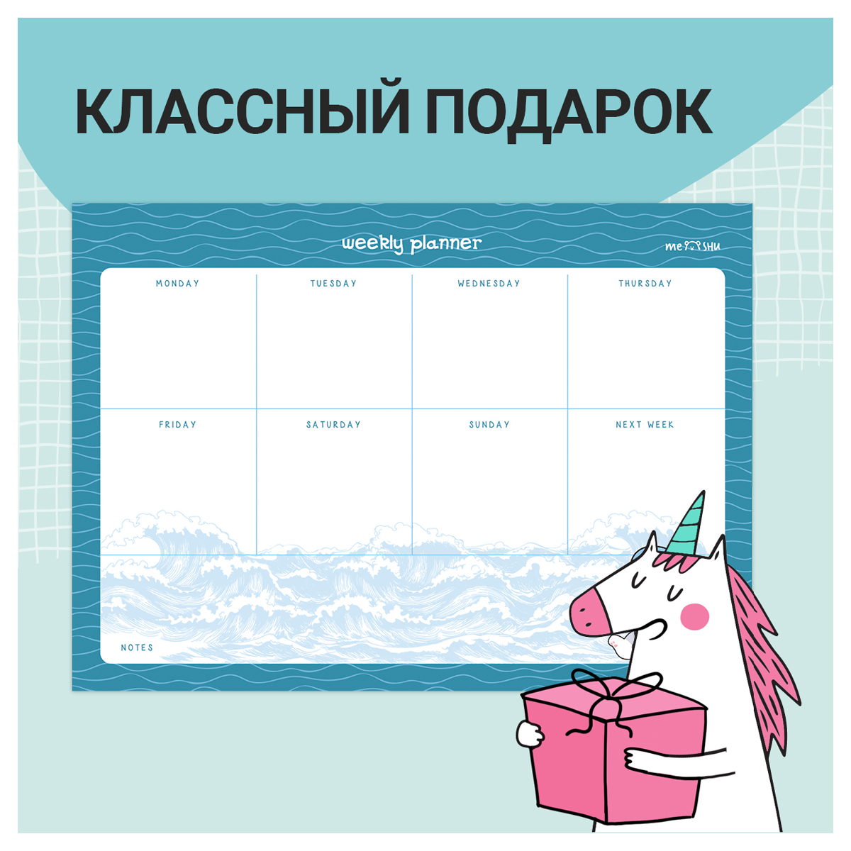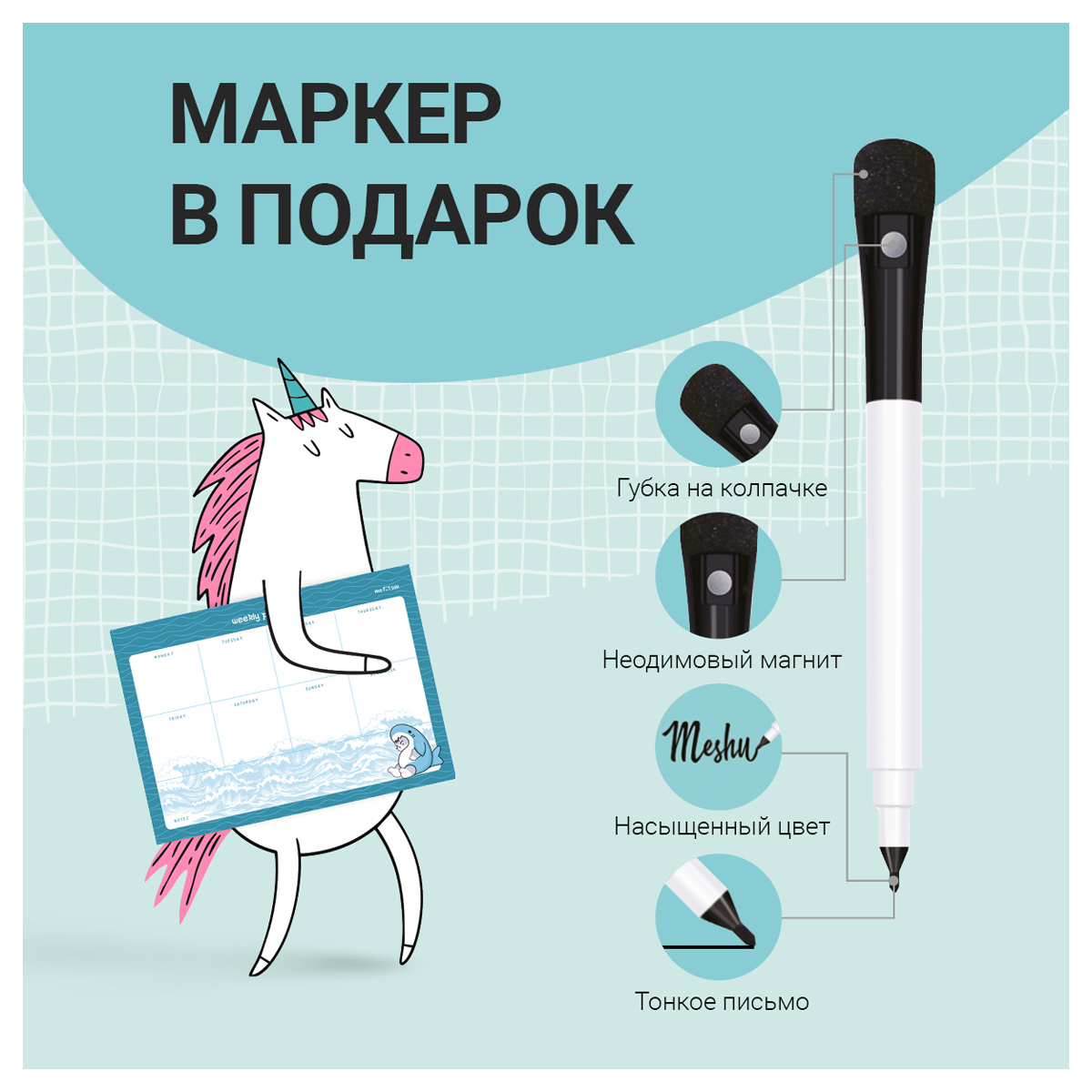 Магнитный планер на неделю MESHU Marine style – отличный помощник в планировании времени. Планер формата А4 выполнен из картона плотностью 200 г/м2, покрытого магнитным винилом. Ламинация позволяет многократно писать и стирать надписи. Размер магнитного расписания – 210*297 мм. В комплекте прилагается маркер на магните со стирателем, которым очень удобно корректировать записи и крепить его к любой металлической поверхности (например, к холодильнику). Внимание! Используйте только маркер на водной основе. Для очистки поверхности используйте влажную салфетку. Планер выполнен в оригинальном универсальном дизайне. Он поможет запомнить задачи, спланировать расписание и встречи с коллегами, друзьями или семьёй. <br/>Комплект упакован в индивидуальный пакет. <br/>• Формат: А4;<br/>• Размер: 210*297 мм;<br/>• Материал: картон, магнитный винил;<br/>• Плотность картона: 200 г/кв. м;<br/>• Пол: универсальный.