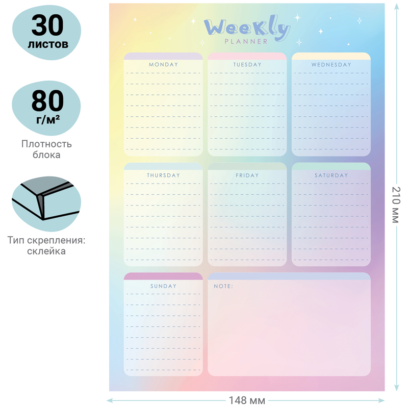 Планер на неделю на склейке MESHU Candy color поможет стильно и удобно фиксировать важные дела и задачи. Плотность офсетной бумаги составляет 80 г/м2. Размер недатированного планера – 148×210 мм, 30 листов в блоке.