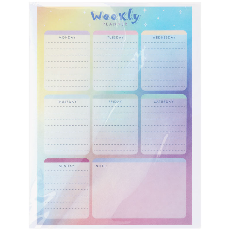 Планер на неделю на склейке MESHU Candy color поможет стильно и удобно фиксировать важные дела и задачи. Плотность офсетной бумаги составляет 80 г/м2. Размер недатированного планера – 148×210 мм, 30 листов в блоке.<br/>Личное рабочее пространство станет ярче благодаря оригинальному дизайну планера. Склейка поможет аккуратно отрывать листы, не повреждая их. Блок для записей представлен в индивидуальной упаковке в пакет с европодвесом.<br/>• Количество листов: 30;<br/>• Цвет блока: цветной;<br/>• Склейка: есть;<br/>• Тип планинга: недатированный
