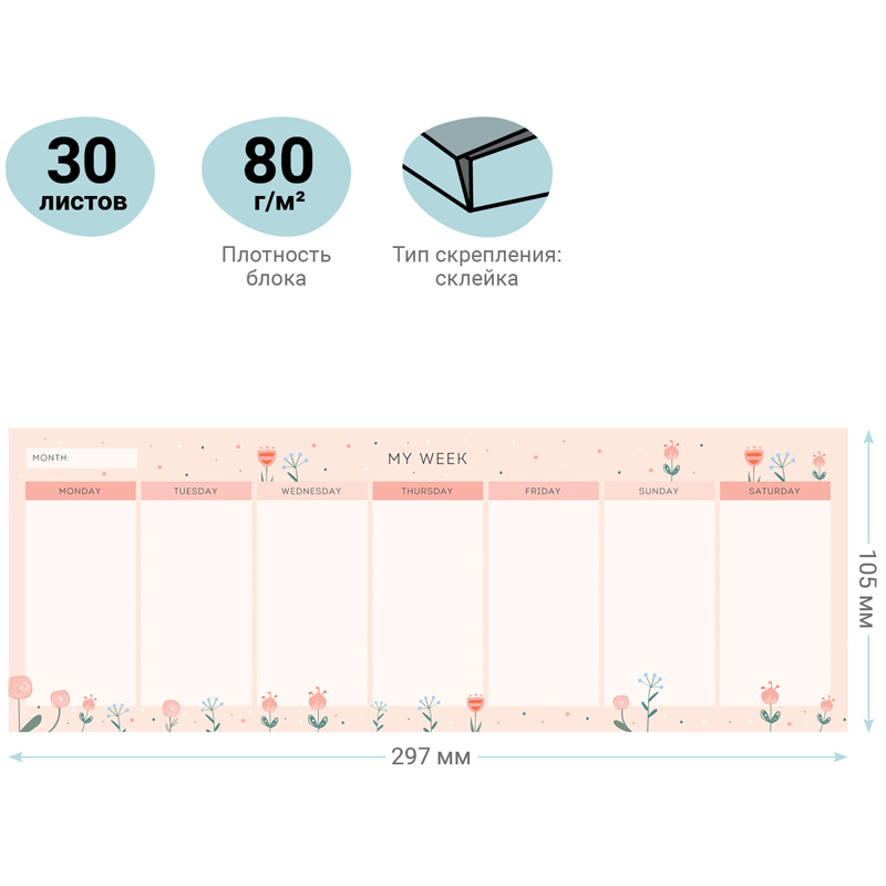 Планер на неделю на склейке MESHU Meadow поможет стильно и удобно фиксировать важные дела и задачи. Плотность офсетной бумаги составляет 80 г/м2. Размер недатированного планера – 297×105 мм, 30 листов в блоке.<br/>Личное рабочее пространство станет ярче благодаря оригинальному дизайну планера. Склейка поможет аккуратно отрывать листы, не повреждая их. Блок для записей представлен в индивидуальной упаковке в пакет с европодвесом.<br/>• Количество листов: 30;<br/>• Цвет блока: цветной;<br/>• Склейка: есть;<br/>• Тип планинга: недатированный