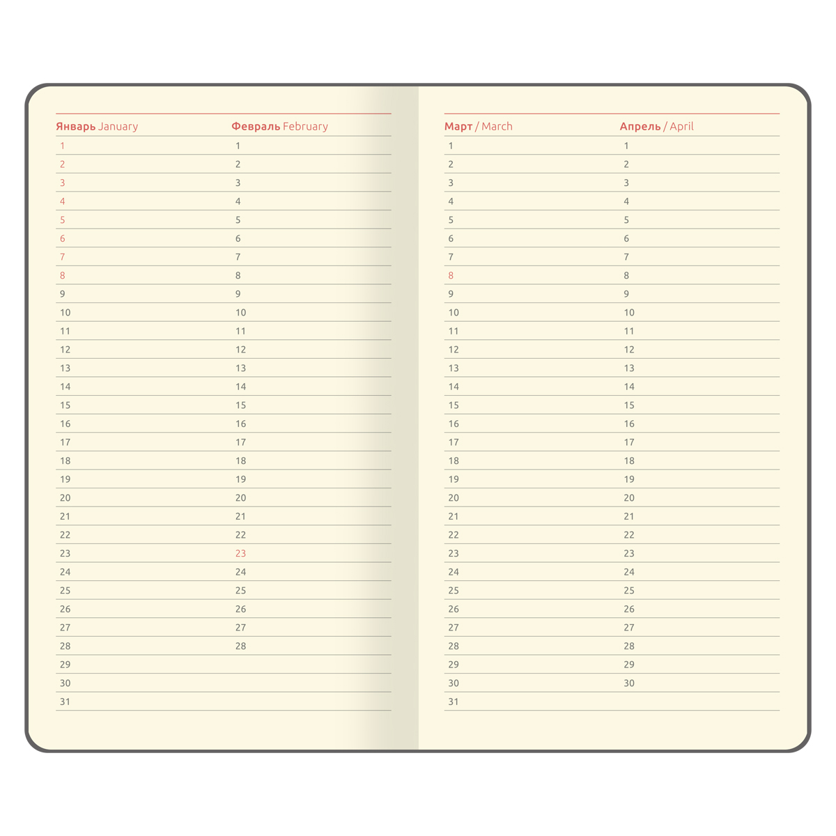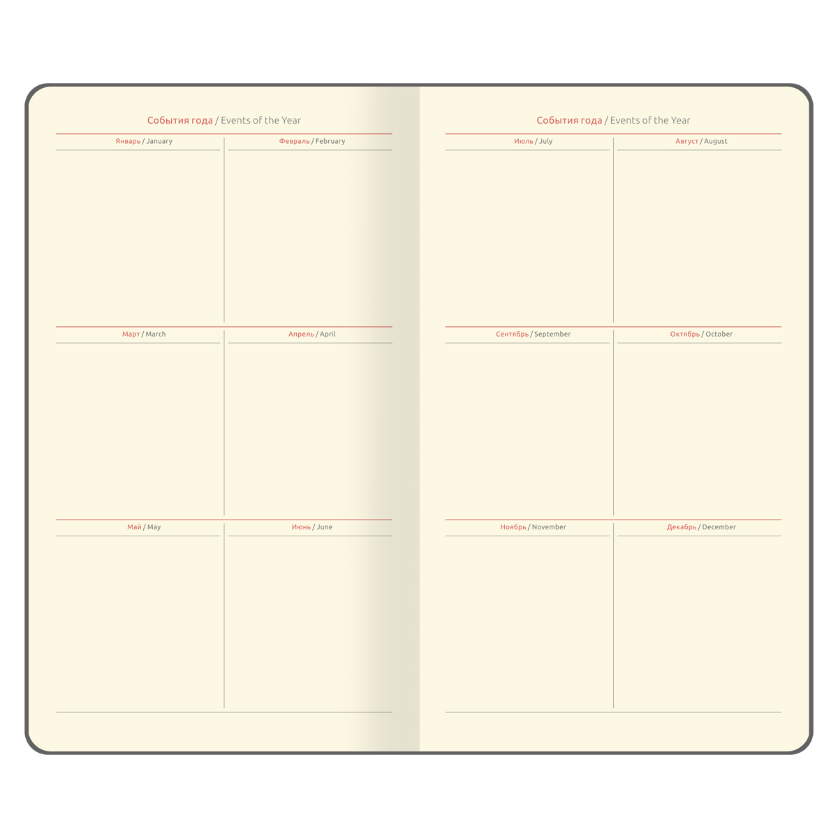Мягкая, но при этом прочная обложка из экокожи приятна на ощупь. Дизайн форзаца является лаконичным продолжением обложки. Ориентация – вертикальная.