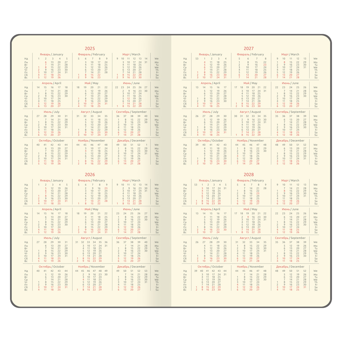 Удобный разворот на неделю позволяет легко планировать встречи, задачи и заметки, а элегантная закладка обеспечивает быстрый доступ к нужной странице. Надёжная фиксирующая резинка не даст еженедельнику произвольно открыться. Содержит календарь на 4 года, листы для записи контактов, заметок и зарисовок.