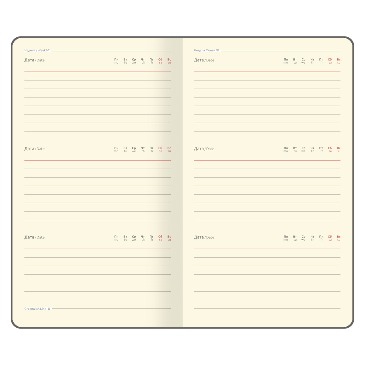 Еженедельник недатированный Greenwich Line серии "Floret" поможет оставаться организованным и элегантным. Еженедельник размером 103*176 мм содержит 64 листа высококачественной белой бумаги повышенной плотности 80 г/м2 с пантонной печатью в 2 краски.