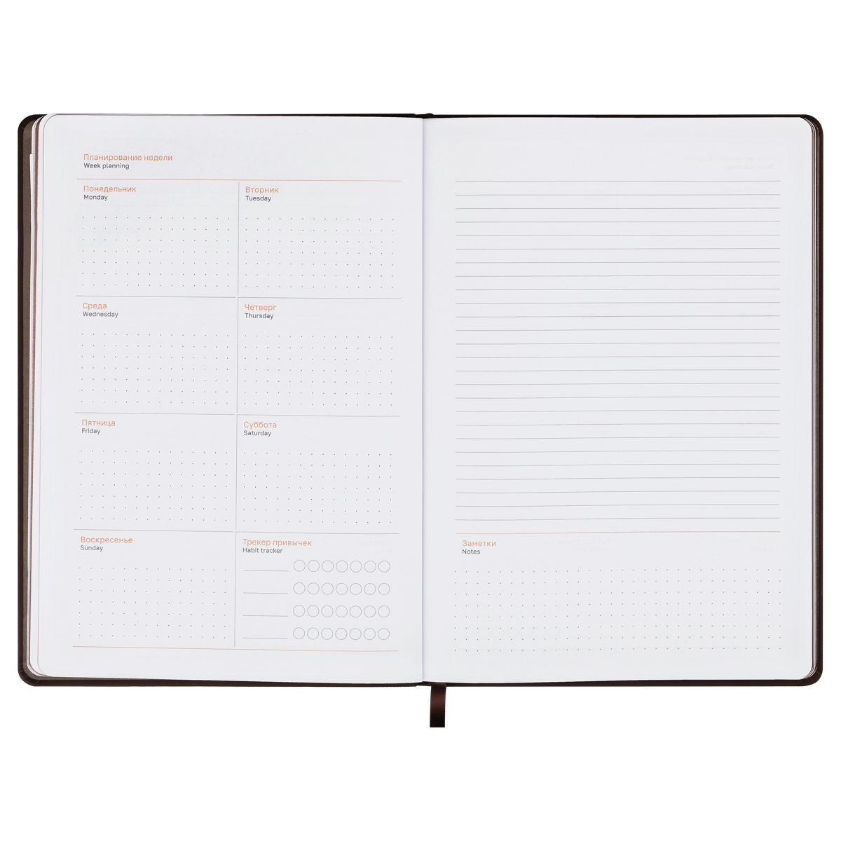 Удобный разворот на неделю позволяет легко планировать встречи, задачи и заметки, а элегантная закладка обеспечивает быстрый доступ к нужной странице. На одной стороне расположен трекер привычек и все дни недели. На другой – место для записей и заметок.