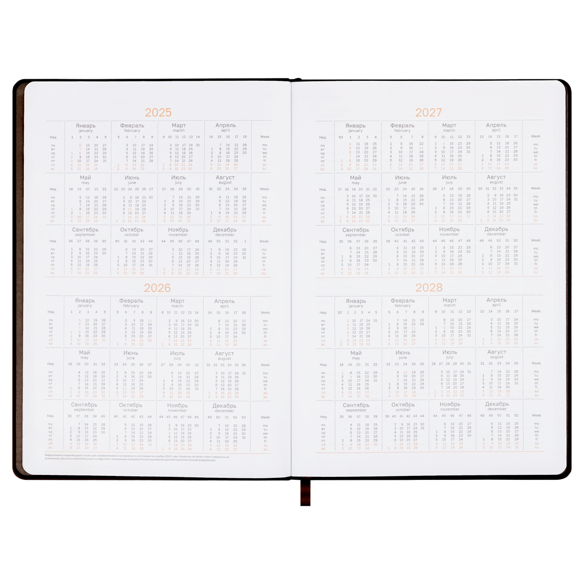 Еженедельник формата B5 размером 175*250 мм содержит 64 листа высококачественной кремовой бумаги повышенной плотности 70 г/м2 с пантонной печатью в 2 краски.