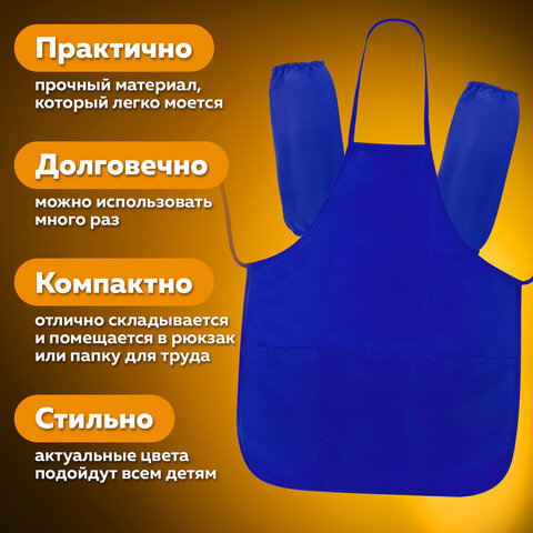 Предназначено для учеников начальной школы. Накидка-фартук и нарукавники защитят одежду от загрязнений в процессе занятий творчеством. Предусмотрено для многоразового использования.