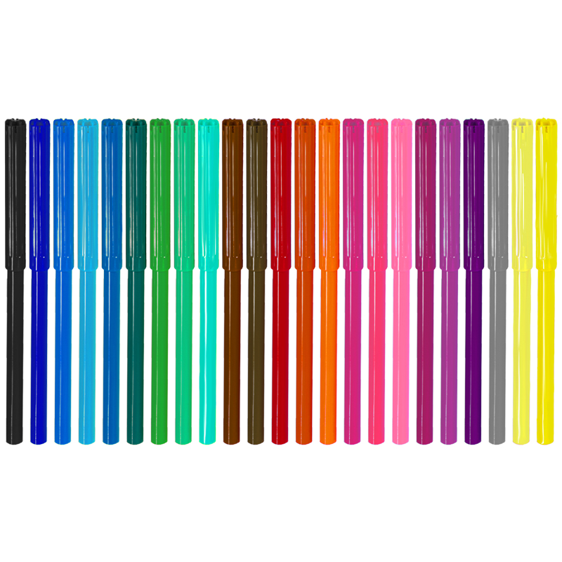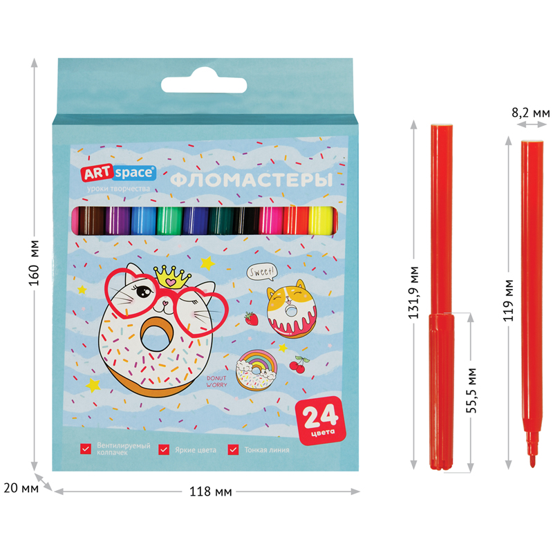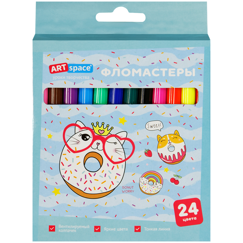 Набор фломастеров. 24 ярких цвета. Вентилируемый колпачок, смываемые чернила на водной основе. Упакованы в картонную коробку с подвесом.