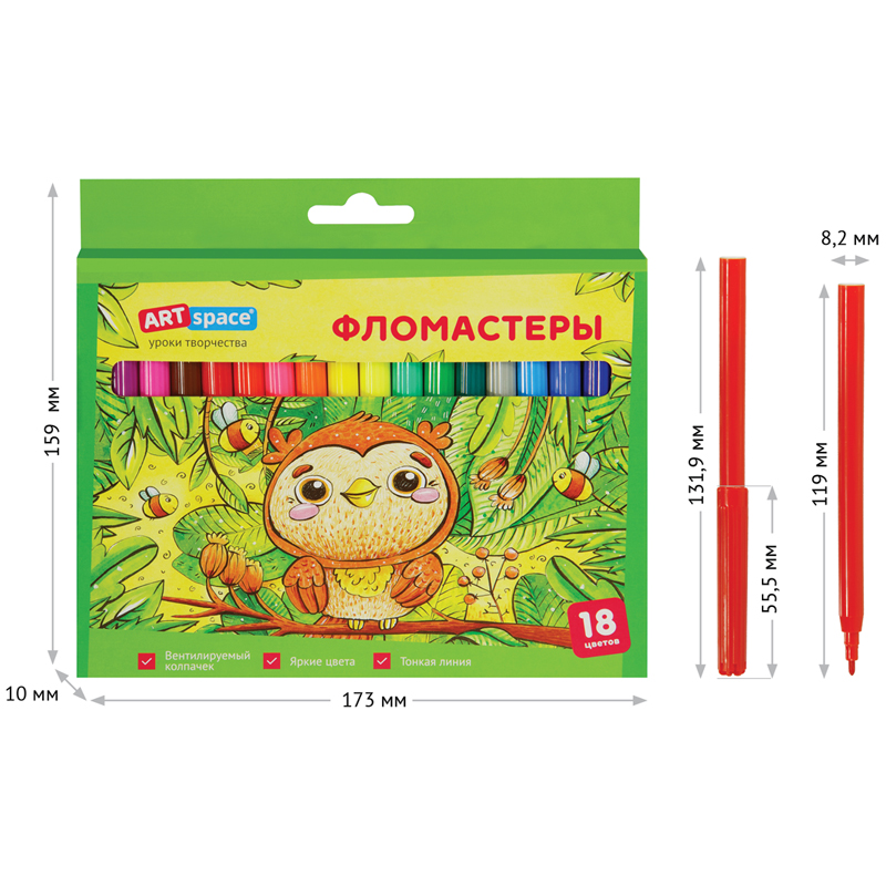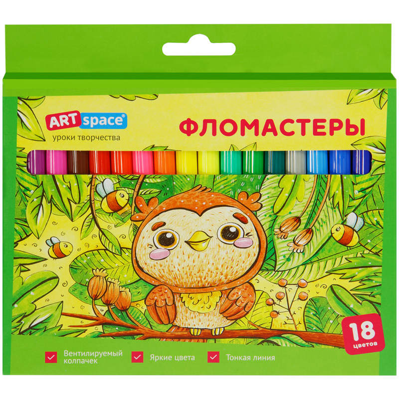 Набор фломастеров. 18 ярких цветов. Вентилируемый колпачок, смываемые чернила на водной основе. Упакованы в картонную коробку с подвесом.
