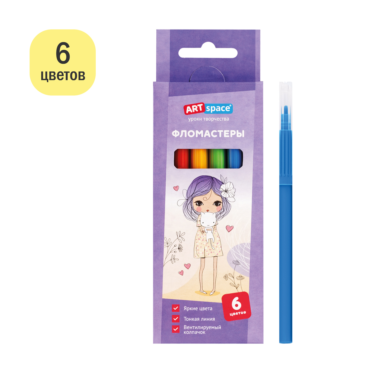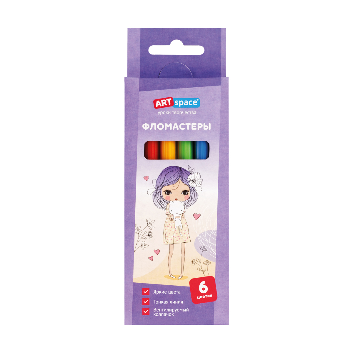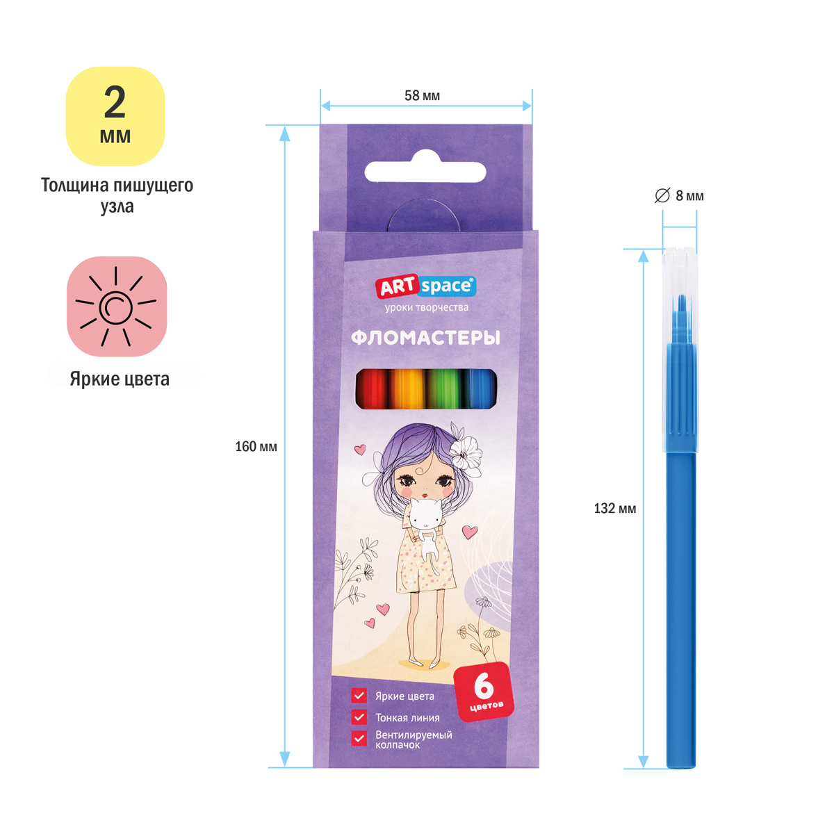 Фломастеры ArtSpace серии «Модницы» представлены с легкосмываемыми чернилами и вентилируемым прозрачным колпачком. Толщина линии письма составляет 0,5-1,0 мм. В наборе 6 ярких цветов. Тип наконечника – конический. Смываемые фломастеры на водной основе нетоксичны. Набор фломастеров упакован в яркую картонную коробку с европодвесом.<br/>• Количество цветов: 6;<br/>• Тип наконечника: конический.