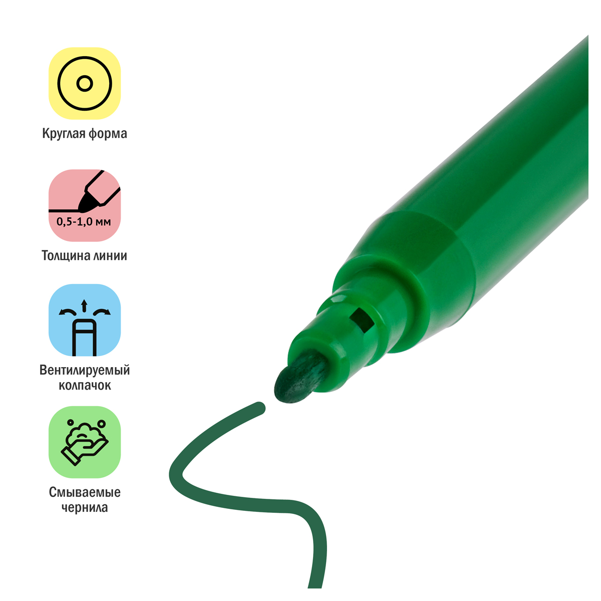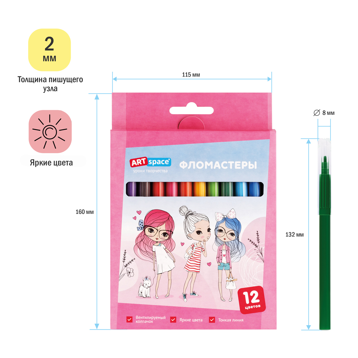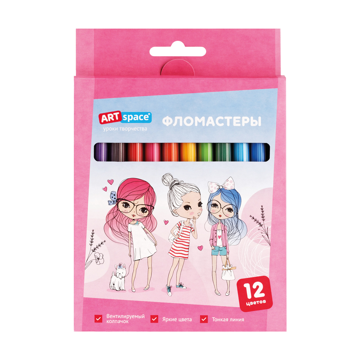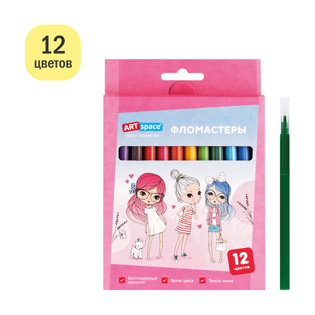 Фломастеры ArtSpace серии «Модницы» представлены с легкосмываемыми чернилами и вентилируемым прозрачным колпачком. Толщина линии письма составляет 0,5-1,0 мм. В наборе 12 ярких цветов. Тип наконечника – конический. Смываемые фломастеры на водной основе нетоксичны. Набор фломастеров упакован в яркую картонную коробку с европодвесом.