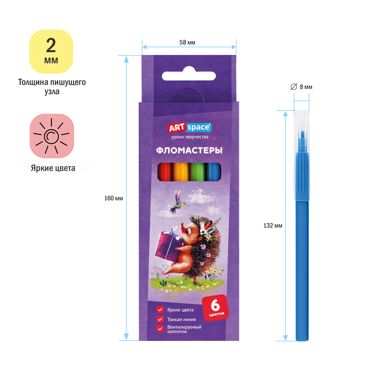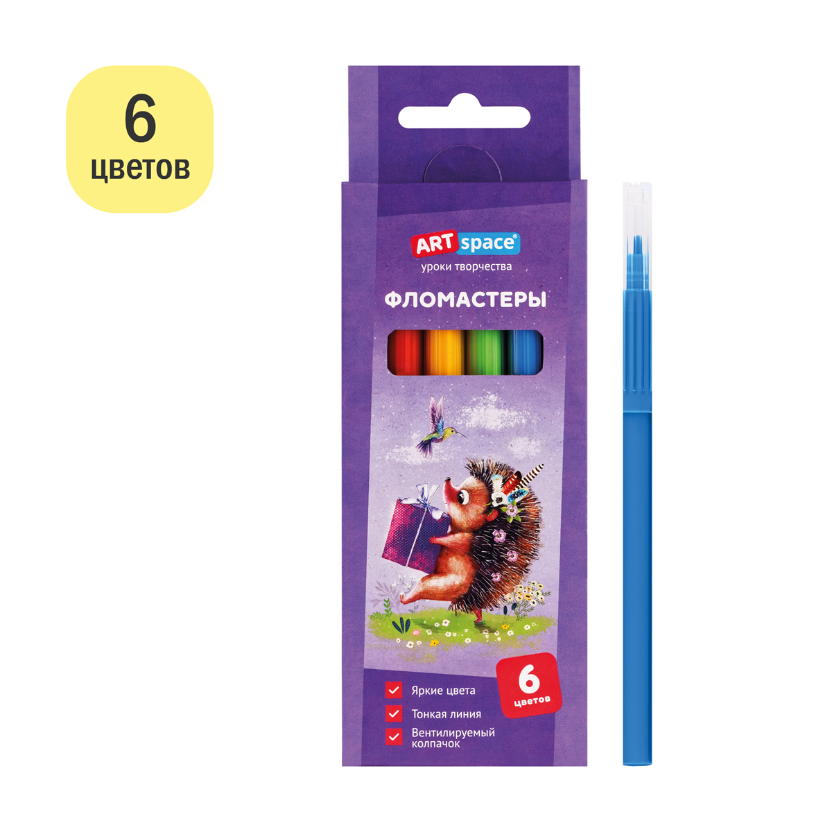Фломастеры ArtSpace серии «Рисунки. Lovely animals» представлены с легкосмываемыми чернилами и вентилируемым прозрачным колпачком. Толщина линии письма составляет 0,5-1,0 мм. В наборе 6 ярких цветов. Тип наконечника – конический. Смываемые фломастеры на водной основе нетоксичны. Набор фломастеров упакован в яркую картонную коробку с европодвесом.