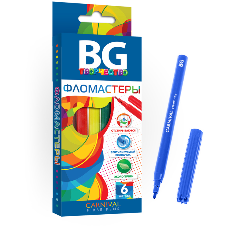 Яркие и насыщенные фломастеры – 6 цветов. Изготовлены из хорошего пластика, оснащены вентилируемым колпачком, согласно нормам безопасности, и легко отстирываются с одежды. Диаметр корпуса – 8 мм, размер с колпачком – 133 мм.