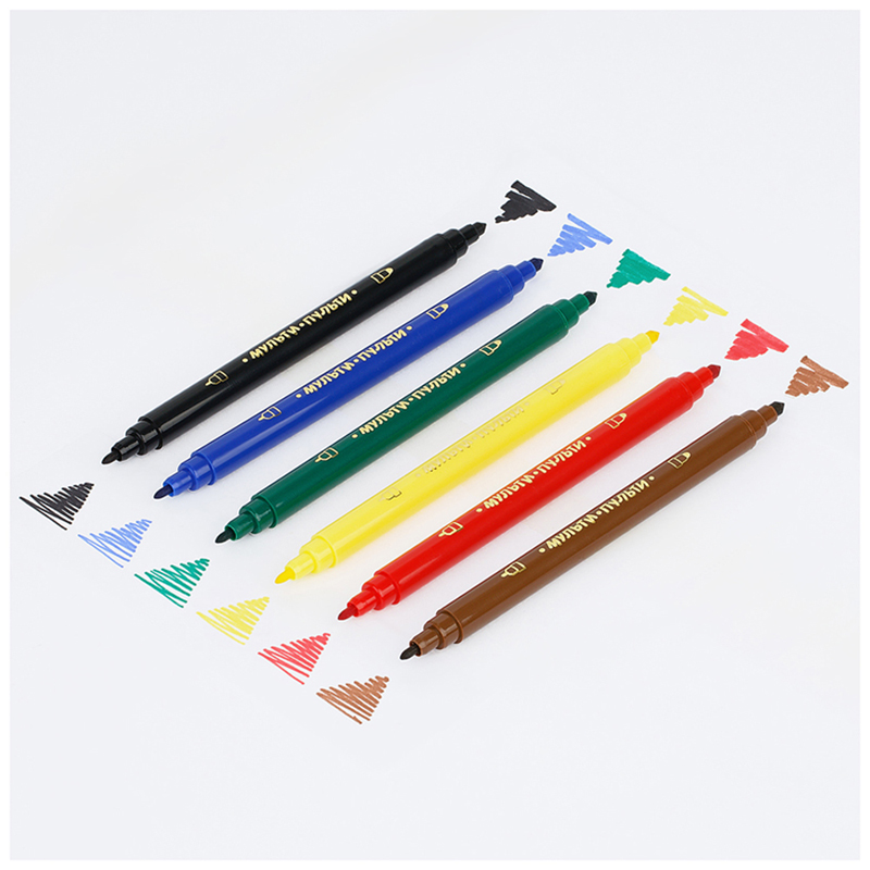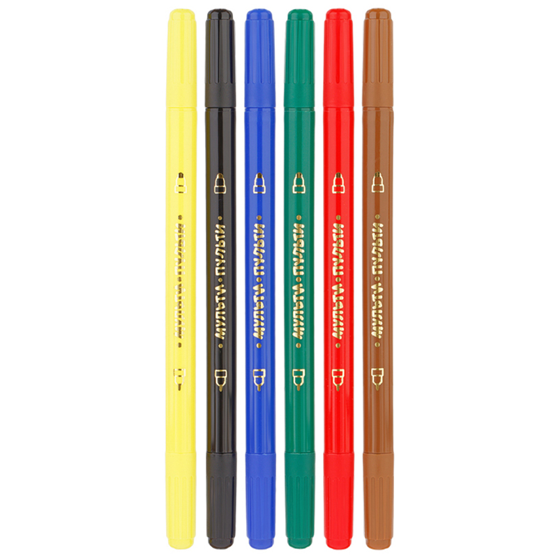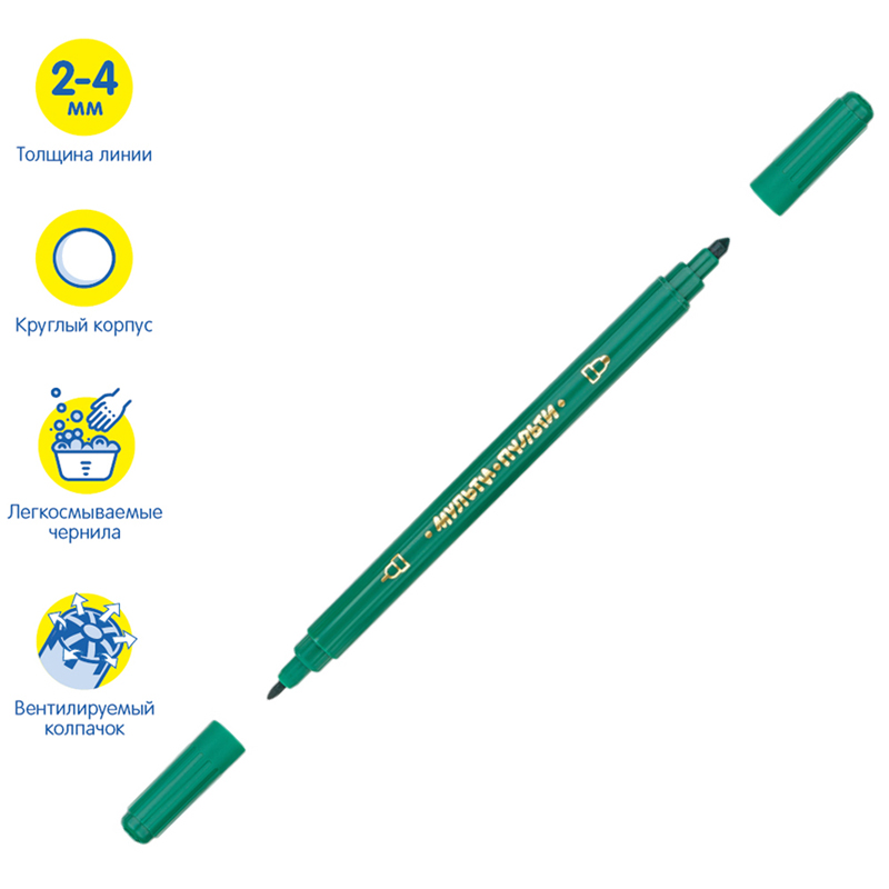 Двусторонние фломастеры «Мульти-Пульти» серии "Енот в Бразилии" представлены с легкосмываемыми чернилами и вентилируемым колпачком. Тип наконечника – конический. Толщина линии составляет 4 мм, длина письма – не менее 260 метров. Корпус круглой формы изготовлен из полипропилена и имеет удобную круглую зону захвата диаметром 8 мм. Двусторонние фломастеры имеют два пишущих узла: тонкий и толстый, вентилируемые колпачки. В наборе 6 цветов: красный, чёрный, синий, коричневый, зелёный, жёлтый. Фломастеры сохраняют стабильный цвет при письме на протяжении всего использования. Смываемые фломастеры на водной основе нетоксичны. Упакованы в картонную коробку.<br/>• Количество цветов: 6;<br/>• Тип наконечника: конический;<br/>• Длина линии письма: 260 метров.