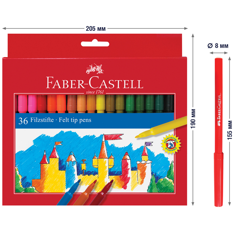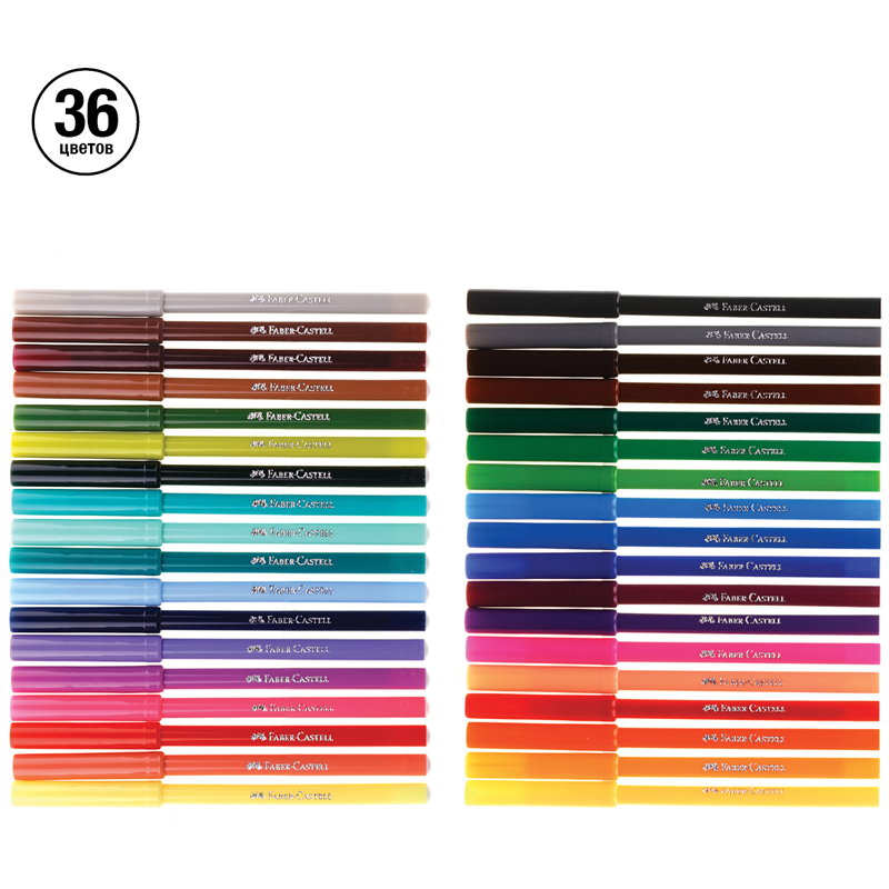 Фломастеры Faber-Castell с широкой палитрой цветов. В наборe 36 ярких цветов. <br/>Фломастеры Faber-Castell представлены с удобным круглым корпусом. Чернила на водной основе смываются с большинства тканей. Фломастеры представлены с прочным коническим наконечником. Упакованы в картонную коробку с европодвесом.<br/>• Количество цветов: 36;<br/>• Тип наконечника: конический
