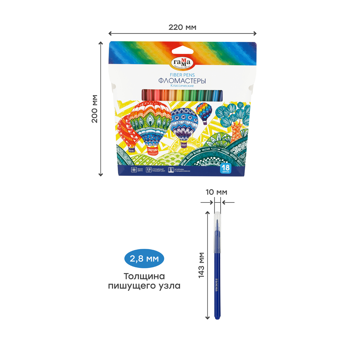 Фломастеры ГАММА серии «Классические» отлично подойдут для детского творчества. В наборе 18 насыщенных цветов. Чернила на основе воды и пищевых красителей легко смываются с одежды и рук и избавят от хлопот после рисования. Колпачок фломастера вентилируемый, что поможет избежать негативных сценариев при проглатывании его ребенком. Корпус круглой формы диаметром 10 мм изготовлен из безопасного полипропилена и имеет удобную круглую зону захвата. Тип наконечника – конический. Толщина пишущего узла – 2,8 мм позволяет наносить как тонкие, так и толстые линии для создания ярких рисунков. Набор фломастеров упакован в красочную картонную упаковку-конверт с европодвесом, которая может вдохновить ребёнка на творчество. Продукция морозоустойчива.