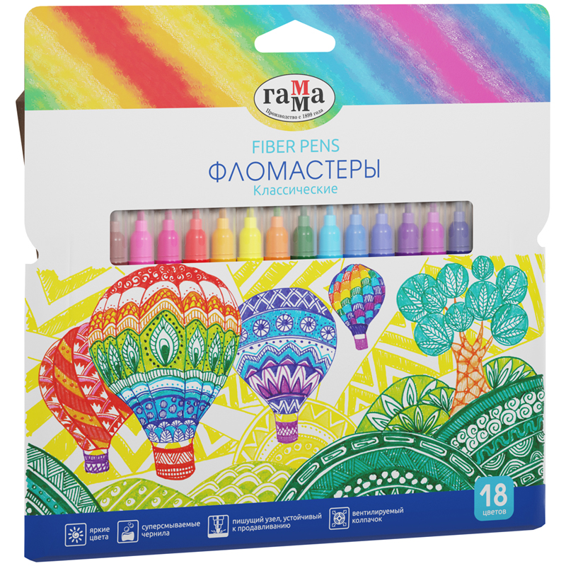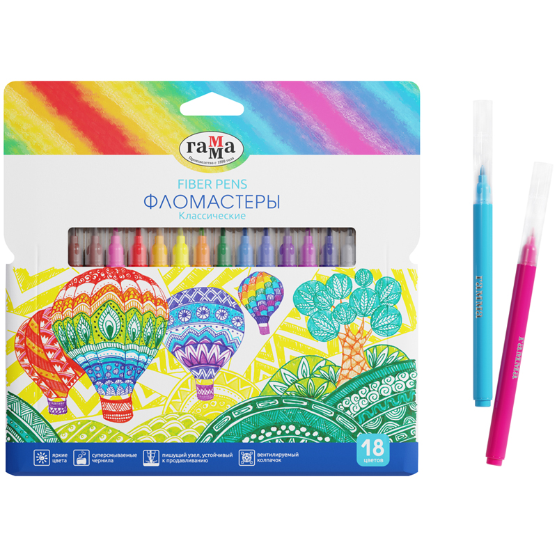 Фломастеры ГАММА серии "Классическая" созданы для комфортного рисования. Конический тип наконечника имеет толщину линии письма до 2,6 мм. В наборе 18 цветов. Фломастеры серии "Классические" - это удобная упаковка-конверт, насыщенные цвета и тонкий наконечник, который позволяет наносить тонкие, четкие штрихи и развивать правильную технику рисования у детей. Чернила на основе воды и пищевых красителей, легко смываемые с одежды и рук, избавят от хлопот после рисования. Широкая цветовая палитра дает ребенку неограниченные возможности для творчества, развивая его художественные способности, а яркая, красочная упаковка может быть использована в качестве ориентира для воспроизведения ребенком. Упакованы в картонную коробку.<br/>• Количество цветов: 18;<br/>• Тип наконечника: конический.